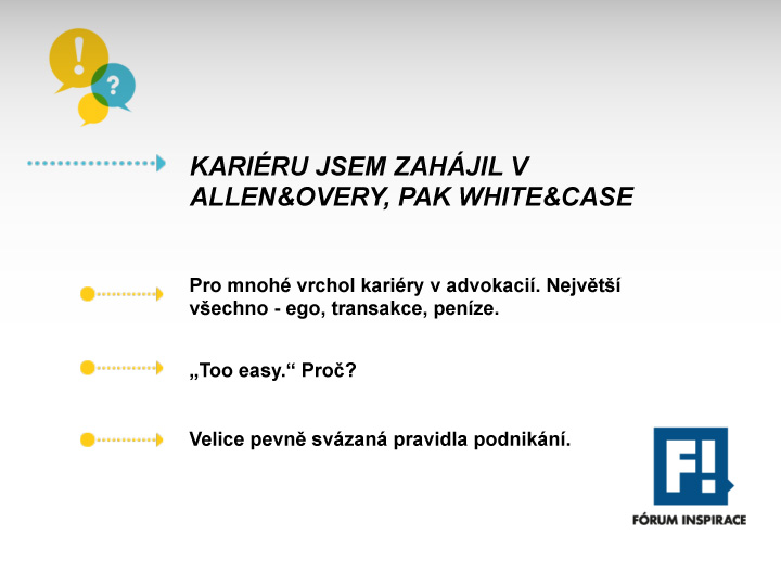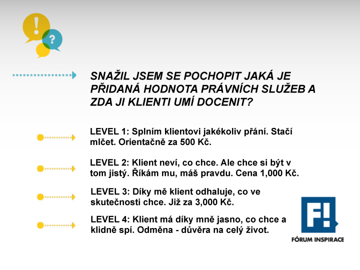 During the year I successfully manage about six medium-sized transactions for international clients, as well as for Czech and Slovak owners, worth around 20 million EUR. Regarding the subject of M&A, I do several lectures for seminars.cz and economia.cz. Furthermore I prepare a lot of contractual documentation for Czech and Slovak companies, so that my clients have clear guidelines for their customers and suppliers. But most interesting for me is definitely the work on motivational programs for employees, including setting up effective models of "corporate governance" and organizational structures. Among other pro bono activities, I like to participate in the Initiative Domluvte.se.